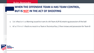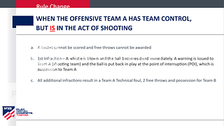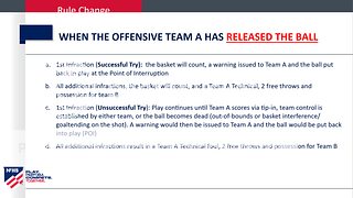 WHEN THE OFFENSIVE TEAM A HAS RELEASED THE BALL 1st Infraction (Successful Try): the basket will count, a warning issued to Team A and the ball put back in play at the Point of Interruption All additional infractions, the basket will count, and a Team A Technical, 2 free throws and possession for team B 1st Infraction (Unsuccessful Try): Play continues until Team A scores via tip-in, team control is established by either team, or the ball becomes dead (out-of-bounds or basket interference/ goaltending on the shot). A warning would then be issued to Team A and the ball would be put back into play (POI) All additional infractions result in a Team A Technical foul, 2 free throws and possession for Team B Last edited by bob jenkins; Tue Oct 22, 2024 at 11:30am. |