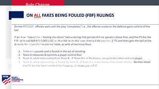 We spent thirty minutes alone on all the permutations of the new faking being fouled rule, warnings and technical fouls, faking by offensive players and defensive players, signals, whistles, and delayed whistles. Our local interpreter (also the Connecticut State interpreter) mentioned a very odd situation where a team on offense could actually gain an advantage by faking being fouled. Team A has not been warned in the game for faking being fouled. Team A has the alternating possession arrow. Team A has the ball. Team A is leading by one point very late in the game. Thirty-five second shot clock is winding down. A1, after releasing a jump shot, intentionally fakes being fouled. Official sounds his whistle and signals an open hand to stop the clock and the faking being fouled signal. Ball hits the rim and bounces off the rim. Official reports that Team A faked being fouled to the table and a warning is issued. No team control on the attempted shot, so go to the alternating possession arrow. Team A gets the ball. Since the ball hit the rim, Team A also gets a full thirty-five seconds on the shot clock. Our interpreter told that the NFHS is aware of this odd situation, they believe that coaches are smart enough to take advantage of this situation, and will issue an interpretation regarding such in early December.